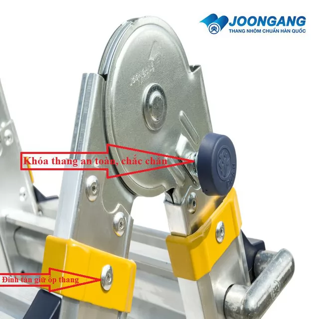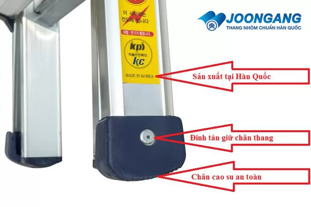 Các bậc thang được hàn 2 mặt vào chân thang bằng robot trong nhà máy sản xuất, điều này giúp cho bậc thang được gia cố 1 cách vững chắc vào chân thang, khía cạnh này là rất đặc biệt chỉ sở hữu ở thang nhôm Joongang, trong khi những hãng thang nhôm khác chỉ hàn một mặt dễ dẫn đến tình trạng đang dùng bậc thang bị bung ra rất hiểm nguy khi làm việc ở độ cao lớn Cuối chân thang được bọc bằng chân cao su sở hữu tính đàn hồi cao, giúp thang ko bị trơn trượt lúc dùng ở các địa hình dốc, trơn tuột trượt và tránh bị trầy xước nền nhà, hay mặt bằng đang thi công